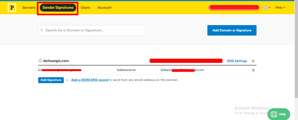 4. Once you created your server, Go to Sender Signatures option.