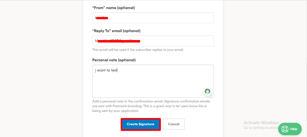 5. Add your From email, From name and reply to email then choose Create signature.