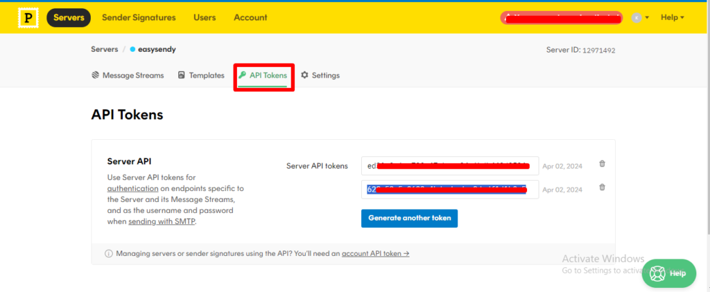 7. Click on your server and go to API tokens option and copy the generated server API token.