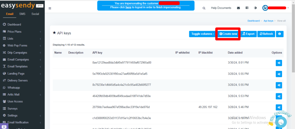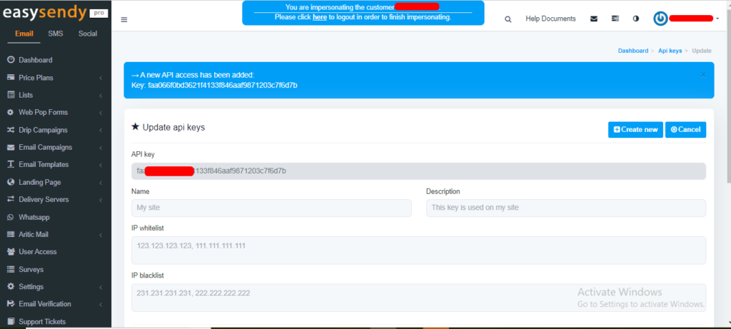 3. On the new screen, click on “Create New API” and the new API key will be generated.