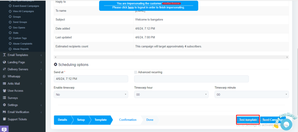 2. Test email template button option come when you are at email template design step, just before the confirmation step, during email campaign design.