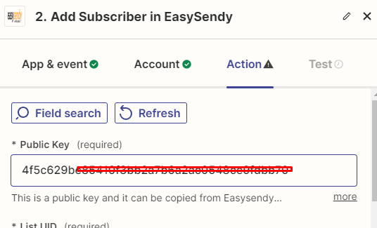 5. On the next screen, add your EasySendy Pro account API key. You can follow this guide to get the API key. After entering EasySendy Pro API key, select the email field from your triggered application account.